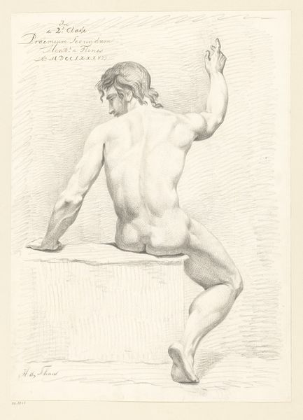 Editor: Here we have "Zittend mannelijk naakt, op de rug gezien," or "Seated Male Nude, Seen from the Back," by Derk Anthony van de Wart, likely from 1788. It's a pencil drawing and rather striking in its anatomical detail. What’s your perspective on this particular nude? Curator: It's compelling when viewed through the lens of artistic production and labor. The precision required in academic drawing signifies intense training, part of a larger system that validates specific artistic skills within a particular class structure. We should consider this not just as an aesthetic object, but also the product of skilled labor, a physical process embedded within a socio-economic context. Notice the subtle nuances achieved using only graphite. It shows a mastery achieved through hours of practice. Do you see any implications here when understanding materiality, and not simply art? Editor: I hadn't considered the intense labor. You're right, you can almost *feel* the hours of practice in those lines. The emphasis on draftsmanship connects it to the academic system and its role in defining “high” art versus craft. What can you tell by looking at his posture and expression? Curator: Considering this piece was awarded second prize, one could examine the very means of how artistic competition could either legitimize, as well as commodify and potentially exploit an artist and their intellectual, physical property. One should further question how awards can contribute to a social and cultural canon. It gives food for thought. Editor: Definitely, thinking about the social and economic forces behind this drawing really deepens my understanding of it. It makes me realize how art making is closely related to cultural validation. Thanks for broadening my understanding!