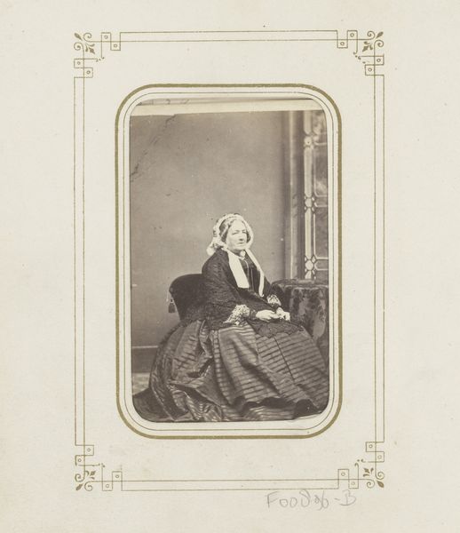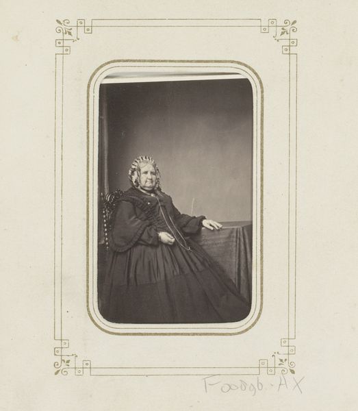 Editor: Here we have "Portret van een vrouw, zittend aan een tafel," which translates to "Portrait of a Woman, Sitting at a Table." It's an albumen print, dating from about 1855 to 1865. The London School of Photography produced this photograph, and I find its somber tone so striking. What can you tell me about this piece? Curator: Well, imagine yourself in her place. Truly *feel* the weight of that magnificent skirt – I bet it could double as a parachute, or at least soften a fall from a moderately tall bookshelf! What was photography trying to achieve then, compared to a painted portrait? And why would a portrait at that time involve props like tables or curtains? Editor: It's a very posed portrait; it seems quite formal. Maybe that was a sign of the times. How does the presence of objects inform the viewer? Curator: I wonder if the book represents the woman's intellect, and the curtain... the curtain, darling, that's just pure theatre! But also consider that portraiture was becoming more accessible, and more diverse. In some ways it was competing with paintings but in some ways just capturing the very core of likeness and what that could represent for a family. Was it only about capturing appearance? Was it more about how families were hoping to present themselves to the world and, potentially, posterity? Editor: The way it democratized art in a new way is certainly a concept to consider. Thank you so much! I’m so eager to continue diving deep! Curator: Indeed! Always peel back those layers, sweet pea. Now, about that parachute-skirt... do you think she ever considered using it in an escape from boredom? I bet there’s a story there somewhere.