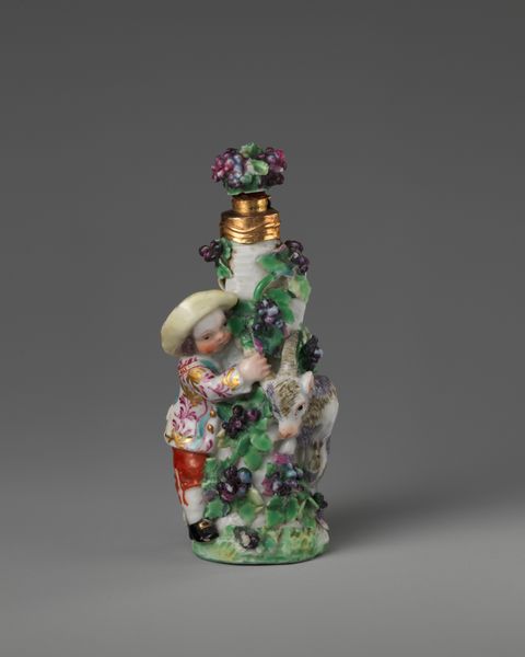 Curator: Here we have a charming porcelain sculpture titled "Boy letter-writer and girl in group," created by the Chelsea Porcelain Manufactory between 1754 and 1764. Editor: It's whimsical. The eye is immediately drawn to the contrasting textures—the smooth porcelain figures against the matte finish of what looks like a little well. It's balanced but with a distinct upward movement, those florals leading the eye upwards. Curator: The rococo style is evident in the delicate details and playful subject matter. It really encapsulates the themes valued at the time. Genre scenes like this speak volumes about 18th-century societal ideals and childhood innocence. Notice the young boy, seemingly preoccupied with writing, while the girl playfully peeks around the floral covered column. Editor: Absolutely. There's a strong use of semiotic codes embedded in the flowers too. It begs us to decode a subtle system of desire and coquetry. Curator: Beyond aesthetics, this piece offers insights into gender roles during the Enlightenment. Is the boy meant to embody diligence and intellectual pursuit, and is the girl a passive, beautiful observer? How do class dynamics play into it when porcelain production, itself, relies upon exploited labour in a different part of the world? The perfume bottle on top might reveal it as a commodity designed for wealthy aristocratic clients. Editor: And what a detail! The materiality here, the tactile quality of the porcelain, it demands that we remember Walter Benjamin’s aura and the history of decorative art objects. The slight asymmetry also makes this object especially captivating. The gold accents highlight both sculptural detail and function as a luxurious enhancement to the sculpture. Curator: This is a tiny piece but raises significant points regarding consumerism, societal norms and even economic realities that underpinned such production in Europe, it seems that playful imagery hides complex meanings that invite further exploration! Editor: Indeed. The work encourages one to investigate how form and material interweave to reflect those intricacies and values in eighteenth-century aesthetic culture.