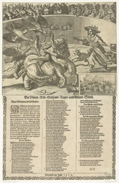 Editor: Here we have "Spotprent op de Vrede van Utrecht", a print made in 1713 by Abraham Allard. It's brimming with figures and symbolism, and honestly, it’s a little overwhelming at first glance. There's so much going on. What can you make of it? Curator: It’s indeed quite dense. From a historical perspective, this print functions as a piece of political commentary. The Peace of Utrecht, which it depicts, was a series of treaties that ended the War of the Spanish Succession. The artist, Abraham Allard, uses allegory to express a particular viewpoint on the political climate of the time, likely criticizing the terms of the peace. Notice how certain figures are emphasized while others are marginalized. Consider who benefits and who suffers in this representation. Editor: So, the arrangement of the figures isn't just decorative; it's a way of conveying political messages about power dynamics. The composition directs us to feel sympathetic towards specific groups, is that right? Curator: Precisely. Ask yourself, who are these 'peace-loving heads' arriving in Utrecht, as the title suggests? What are their motivations and agendas? Are they truly bringing peace, or are there ulterior motives at play? Also, how are women represented in the piece? Do their roles signify anything about the socio-political expectations of the time? Editor: That makes me wonder about the specific symbols used. Are there any visual cues that would have been particularly meaningful to audiences back then, but might be lost on us today? The dog for example. Curator: Yes, the dog is likely meant to represent fidelity. Considering the image as a whole, what are those figures loyal to? Were the represented actions seen as faithful to certain ideals or leaders, or did they signal a betrayal? Understanding these symbols reveals the print as more than just a historical record but also an argument. Editor: I hadn't considered how loaded an image like this could be. Thanks for pointing out all the subtle details; it’s much clearer now that it's more about contemporary political dialogue and critique than just peace. Curator: Exactly, we can read the print now as an intervention in the making of history. It makes you think about the role images play in shaping public opinion.