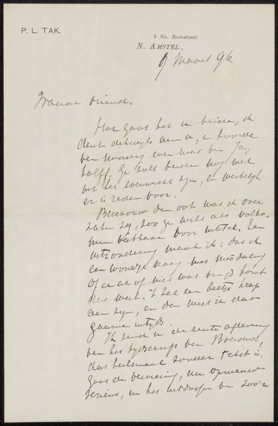 This is "Brief aan anoniem," a letter by Johannes Christiaan Schotel, made in 1820. The letter presents a visual field dominated by dense, dark ink against a pale backdrop. This contrast establishes a clear hierarchy, drawing our eyes to the intricate lines and curves of the handwriting. Schotel's script displays a consistent rhythm, yet it is disrupted by occasional flourishes. These variations introduce an element of the unexpected, suggesting that the letter's content may not be entirely straightforward. The overall composition, with lines tightly packed and margins relatively narrow, creates a sense of confinement, which we can read as a reflection of the social norms and constraints of the time. The materiality of the letter – the paper's texture, the ink's sheen – provides a tactile dimension to the communication. This tactile quality is a reminder of the physical act of writing and the effort involved in crafting each word. We can understand how the formal qualities of the letter, from its composition to its materiality, function as cultural artifacts that convey meaning beyond the text itself.