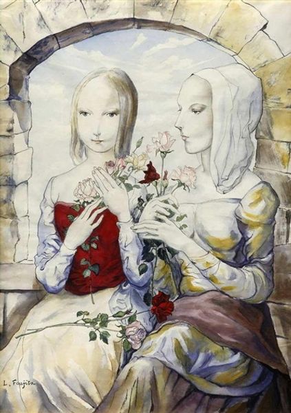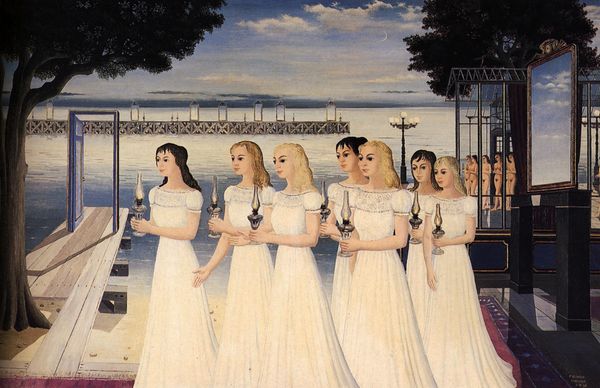 Paul Delvaux's painting, At the Door, presents us with a scene suspended between reality and dream, characteristic of his surrealist style. Delvaux, working in a society undergoing rapid modernization, often looked to classical and mythological themes. Yet, here, his figures, rendered with meticulous detail, stand in a space that defies easy categorization; a liminal zone evoking a sense of voyeurism. The women’s gowns suggest a romantic past, yet their presence is unsettlingly modern. Delvaux creates a compelling tension through such juxtapositions. The figure at the forefront, with her back turned, invites us into the scene, while simultaneously barring our entry, her averted gaze keeps us at a distance. Delvaux once said, "My painting is a translation of the world, but it is a translation governed by the laws of the dream.” The open door functions as a visual metaphor for the threshold between conscious and unconscious states. The painting serves as a poignant reflection on the complexities of identity, desire, and the enigmatic nature of the human psyche.
