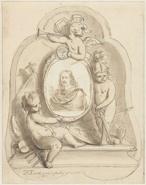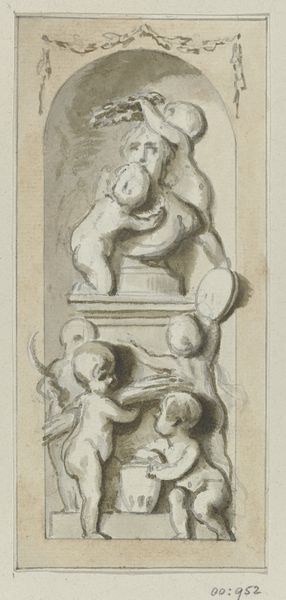 Curator: Here we have a drawing, "Drie Putti," by Jacob de Wit, created sometime between 1705 and 1754. It's rendered in pencil and pen on paper, depicting three cherubic figures clustered around what appears to be a classical bust. Editor: The immediate impression is one of airy lightness, almost as if it were a fleeting dream captured in graphite. The composition is fascinating, how the cherubs playfully interact with the stern, imposing bust above. Curator: De Wit, active during the Baroque period, frequently employed putti – these chubby, winged children – to represent innocence and divine love. Their presence here, intertwined with a likely representation of Neptune given the trident, brings forward intriguing tensions related to social order and mythological narratives. It allows us to read how Baroque era power structures were negotiated, in imagery at least. Editor: Absolutely. Notice the dynamism in the lines; it's all movement and light. The sketchy quality suggests spontaneity, perhaps a study for a larger work? Also, observe the smaller scene below the putti - seemingly another mythological narrative in miniature. There is a balanced, pleasing asymmetry created through the layering and tonal values. Curator: The choice to depict these figures with such soft lines, almost dissolving into the paper, aligns with Baroque conventions that celebrated elaborate embellishment but also with a humanist interest in individual expressiveness. One can almost argue for the idea of "divine childishness," mirroring philosophical discourse around education, privilege, and virtue within wealthy European circles at the time. Editor: The work’s strength also resides in its compositional arrangement – an ovoid enclosed in a rectangle – an almost perfect combination of shape relationships with interesting perspectival concerns. This, contrasted by the sketched-in quality, yields a strange interplay of precise structural elements alongside fluid organic lines. Curator: Considering De Wit’s other works and historical context of the 18th century, this piece showcases an engagement with power, love, and the playful performance of privilege within wealthy societies. The drawing becomes a silent commentator on a society's fascinations. Editor: Agreed, examining "Drie Putti" exposes a delicate dialogue between solid structure and transient form. This tension is fascinating to explore.