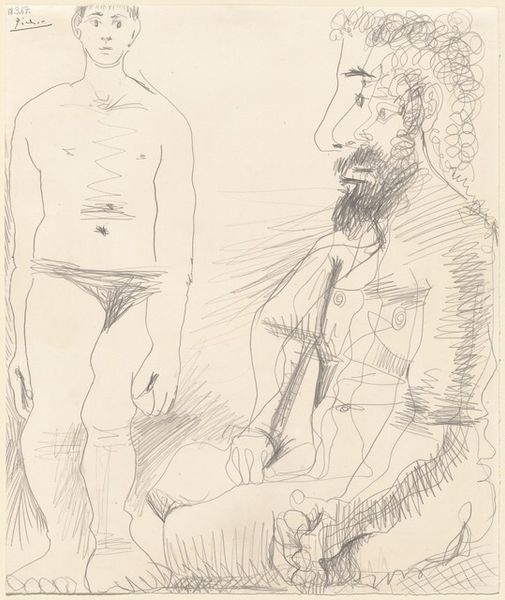 Editor: We're looking at Pablo Picasso's 1933 etching, "Pensive Sculptor, Model with Black Hair, and a Bowl with Three Anemones." The minimal line work gives it this dreamlike, classical quality. What stands out to you about this work? Curator: The stark lines, almost industrial in their precision despite depicting a classical scene, really grab me. Consider the physical process here: acid biting into metal. The artist’s hand, forcing this tool to carve a vision dictated by commerce as much as creative urge. How does the economic reality shape the perceived ‘purity’ of the artistic inspiration? Editor: So, you're saying the technical process is directly linked to the potential market value? Curator: Absolutely! And think about the consumption. Prints are inherently reproducible, destined for circulation, affordable art. Is its accessibility subverting traditional hierarchies, or simply creating new tiers of artistic value within a capitalist system? The subject - a sculptor - reinforces the notion of artistic labour. Editor: Interesting! It makes you think about the artist's role and the value we place on art in general. I guess it is not just about the images! Curator: Precisely. It’s about acknowledging the web of production, the artist as laborer, and the consumption driving the whole spectacle. We need to acknowledge this material reality. Editor: I never considered the etching process in such detail. Thank you, that’s an entirely fresh way to engage with Picasso. Curator: My pleasure. Art is nothing without understanding the hands that make it, the materials they employ, and the society that consumes it.