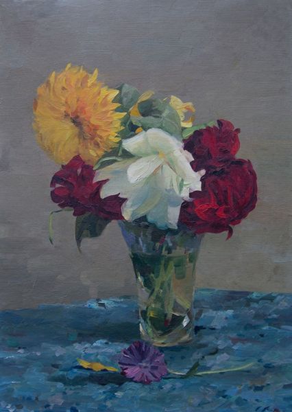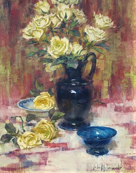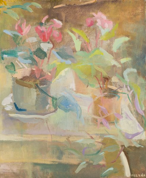 Curator: This painting is titled "Flowers," created by Julian Alden Weir in 1880. You can find this pastel and gouache work over in Gallery 226. What's your first impression? Editor: It's quite dreamlike. The colors are so soft, and everything seems to blend together. There's a nostalgic air about it. Like a memory fading gently around the edges. Curator: That’s interesting, especially if you consider Weir's place in American Impressionism. He's part of a generation seeking to capture fleeting moments and sensory impressions. I’d argue the looseness and sketch-like nature, might suggest the passing of time. Editor: Absolutely! And the vessels holding the flowers seem deliberately chosen. The contrast between the stark white one, teeming with bright yellow daffodils, and the moody greyish-green one that the pink roses inhabit. Are these vessels indicative of Weir’s attitude to capturing nature and how the location of objects affects the reception? Curator: Exactly! The positioning within domestic objects in the piece creates a narrative about control, possession and intimacy and Weir asks these questions from his audience. How complicit we are in altering or domesticating even what we call beauty. Do you notice how he also makes use of his negative space in this painting? The pale ground enhances the other more pigmented sections, giving more of an ethereal and airy feel. Editor: Yes, definitely! The light feels as crucial as the color. It creates a balance in such an unassuming manner and I wonder what the artist was attempting to convey. He's really making a political statement when depicting floral arrangement from a subjective lens in American art history, since the tradition was usually hyper-objective. He shows us, instead, the transience and subjectivity involved in beauty. Curator: Absolutely! These fleeting details ask us about our consumption habits of things considered to be innately "beautiful". Well, it's always a pleasure exploring art with you, and the dialogue with the audiences is what Weir's intention might have been to accomplish from his vantage. Editor: Indeed. It leaves one with much to contemplate long after we move on. Thanks.