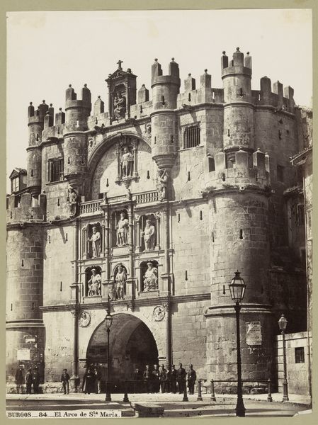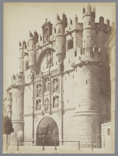 Editor: This is Médéric Mieusement's photograph, "Ingang van het kasteel van Pierrefonds," taken sometime between 1880 and 1900. The composition, especially the stark foreground against the imposing castle, feels intentionally romantic. How do you interpret this work within its historical context? Curator: Well, the choice to depict Pierrefonds Castle is already a powerful statement. Originally a medieval castle, it was largely in ruins until Napoleon III commissioned its reconstruction in the 19th century. This photograph then becomes part of a broader political project. Editor: Political? How so? Curator: Napoleon III aimed to visually connect his regime with the grandeur of French history. Reviving castles like Pierrefonds served as propaganda, projecting power and legitimacy by association. Consider how the image highlights architectural details that evoke a romanticized past. Editor: That’s fascinating. So, Mieusement's photograph isn't just a document, but an active participant in shaping public perception? Curator: Precisely. And the medium itself, photography, played a crucial role. Photography offered a seemingly objective record, lending further credibility to this constructed image of imperial glory. It's less about historical accuracy and more about creating a powerful symbol. Do you see how the photographic process, its apparent objectivity, influences how the public might have perceived this reconstruction? Editor: Absolutely. The photograph almost *authenticates* the revived castle. I guess I hadn't thought about how the "truthfulness" of photography could be used in that way. I initially focused on the composition's aesthetic, but it’s clearly intertwined with politics. Curator: Exactly, and recognizing that entanglement is key to understanding the public role of art during that era. Editor: I will certainly look at photography from the 19th century with new eyes now!