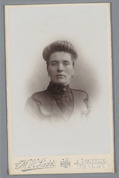 Editor: This gelatin-silver print, "Portret van een onbekende vrouw," made sometime between 1900 and 1928 by Anton Cornelis Thomann, feels incredibly delicate and… fragile. It’s haunting in a way, like a memory fading. What do you see in this piece? Curator: I see the weight of social expectations encoded within the very fabric of this image. The woman’s formal attire and constrained posture, common to that era, speak volumes about the societal pressures placed upon women to embody certain ideals of beauty and propriety. Consider how the photographic process itself, the slow exposure times, would have demanded stillness, further reinforcing the sense of restraint. Editor: That makes sense. The stillness is palpable. It almost feels staged. But I was thinking about the ribbons at her neck – do they signify anything special? Curator: Indeed. Ribbons were often used to denote social standing or affiliations. But also note how her gaze, direct yet subtle, carries a hint of defiance, of individuality striving to emerge from beneath the layers of societal expectation. Isn't it interesting to see how such a "simple" portrait photograph reveals the complicated tapestry of symbols representing cultural memory? Editor: It really is. I wouldn't have thought about it that deeply, without you explaining it to me. Thanks for sharing. Curator: It’s been a pleasure. And perhaps, this woman, frozen in time, can remind us about those who came before. Editor: Yes, I agree. Looking at it this way certainly changes the experience.