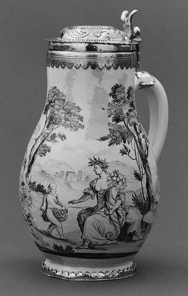 Curator: Good morning! Let's talk about this rather delightful coffeepot from Liverpool, made of porcelain around 1765 to 1775. You'll find it at the Metropolitan Museum of Art. It strikes me as rather playful, doesn't it? Editor: Yes, ornate, absolutely! My initial reaction is whimsy mixed with a definite sense of idealized exoticism. The scenes painted on it feel so stylized; it is a world where even daily rituals have this aura of performance, doesn't it? Curator: Precisely! Notice the Chinoiserie style – those whimsical, slightly inaccurate, and wonderfully imaginative depictions of Chinese life so beloved during the Rococo period. Each figure seems caught in a tiny drama of its own, yet contributes to the pot’s overall narrative. It speaks to 18th-century Europe’s fascination with, and projection onto, the East. Editor: Indeed, it does raise questions about cultural appropriation, or perhaps a lighter "cultural appreciation", but from an imperial gaze, for sure. The imagery seems to borrow vaguely Chinese motifs more for decorative impact rather than authenticity. Look at the "pagoda" next to this figure that looks straight out of a Georgian drawing room! Curator: True, and the floral motifs dancing around the spout and handle further enhance the lightheartedness. One might easily see this piece gracing a grand breakfast table, filled with the rich aroma of freshly brewed coffee. Yet its visual narrative might lead one to consider the origins of that coffee, the voyages that brought it here. Editor: It's a potent reminder of how even everyday objects, like this coffeepot, were, and still are, tangled in global trade and cultural exchange, as well as being icons loaded with implied messages about a long lost era of elegance and good times, maybe gone forever... Curator: Absolutely. Each swirl of its porcelain, each brushstroke tells a silent story about art, trade, aspiration and cultural misunderstanding that we are still unwrapping centuries later. A beautiful object and a silent poem indeed.