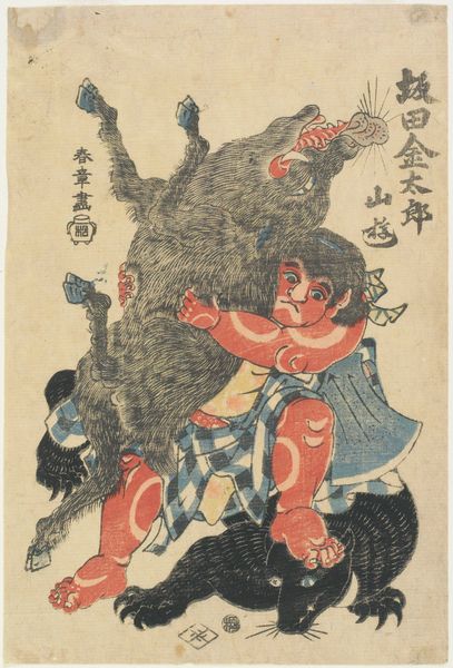 Curator: What a dynamic image! We're looking at a woodblock print by Kitagawa Tsukimaro titled "Kintarō Subduing a Raptor with a Large Axe," created around the 1820s. Editor: It's immediately striking. Kintarō's bright red skin contrasts sharply with the subdued tones of the bird, drawing my eye directly to the figure's determined expression and sheer brute force. It feels both heroic and… a bit comical? Curator: The artist clearly understands how to use color to guide the viewer. The woodblock printing technique allowed for the mass production of these images, making them accessible to a wide audience. It speaks to a broader market for these heroic tales. I wonder, was it popular amongst women as well? Editor: The contrast between the refined watercolor washes and the bold lines suggests a blurring of boundaries between 'high' and 'low' art, and how societal values shape what kind of production methods we value in artistic circles. Also, that large axe has some very specific ornamentation; what sort of meaning is carried by its production quality, if any? Curator: Definitely! Ukiyo-e prints played a vital role in disseminating popular culture. Kintarō, a folk hero known for his superhuman strength, resonated with the common people. And that ornamental axe surely was an important narrative point the culture understood! These prints circulated ideas about masculinity, bravery, and the power of the individual. Editor: Absolutely. And by placing this powerful, almost monstrous figure—red-skinned and muscular—within a familiar natural setting, the print also negotiates Japan's cultural relationship to the untamed world. It looks both fantastical and very earthly, I wonder what the perception and distribution were. Curator: It is a reminder that art is not made in a vacuum, the circulation is key to understanding how values around folk-tales and their values would make it through to the society at large. Editor: Looking closely at this particular woodblock print encourages me to rethink its place within society—the distribution networks, consumer engagement, how this simple artwork helped communicate and form society's values.