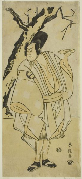 Editor: Here we have Tōshūsai Sharaku’s woodcut print, “Kabuki Actor Ichikawa Ebizō I as Gongorō Kagemasa,” created in 1795. I’m immediately struck by the dynamic tension in the figure's pose and the intensity of his expression. What do you see in this work that stands out to you? Curator: It is intriguing how Sharaku employed lines to depict the actor’s countenance and clothing, effectively imbuing the subject with the semblance of volume, albeit in a notably stylized manner. Do you notice how these stark lines emphasize not only shape but also psychological intensity? Editor: I see how the sharp lines used for the face contrast with the softer patterns in the robes, and how those diagonal robe patterns emphasize the overall dynamism. Curator: Indeed. It is essential to consider the utilization of color, or rather its deliberate limitation. The interplay between the neutral background and the bolder, chiefly ochre and grey-green areas serves to amplify the expressive intensity of the piece, drawing the observer's gaze toward particular focal points. Might this be read as a precursor to modern portraiture's experimentation with abstraction? Editor: It really makes you focus on the form, and that raw emotion becomes so visible through the choices in the composition. I hadn't considered the use of limited color as an emphasizing tool. Curator: Exactly. The deliberate distortion in proportions serves not to diminish the subject, but rather to amplify an essence beyond mere imitation. Such aesthetic decisions invite dialogue on art's purpose. Editor: That’s such an interesting take, focusing on form and the very deliberate choices Sharaku made in that form. It reframes the work, letting you move beyond the simple depiction of a Kabuki actor. Curator: Precisely. Close observation unlocks meaning, revealing an artistic strategy deeply embedded in visual elements.
