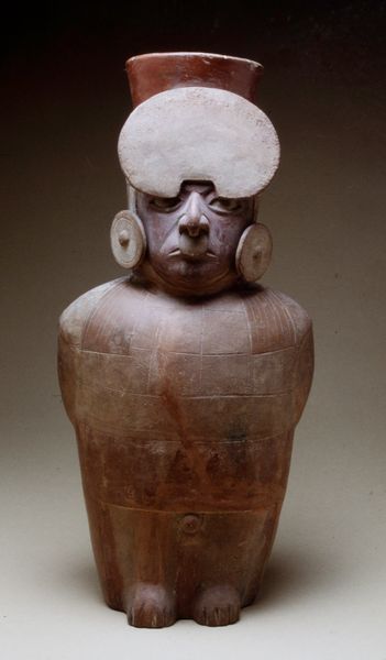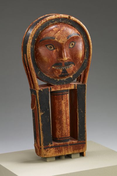Curator: This is an Odumado Mask, attributed to the Igala people and crafted sometime in the 19th or 20th century. It resides here at the Minneapolis Institute of Art. Editor: My first thought is just how intensely crafted it appears, with those sharply etched lines running almost uniformly across the surface of what appears to be aged wood. It has an imposing, almost stoic presence. Curator: Indeed. And that crafted aspect speaks volumes about its significance. The Odumado masks, specifically, represent a key intersection in Igala society, functioning primarily as emblems of power for the community's Ekwo secret society. These weren't just decorations, they embodied legal authority. Editor: So the form dictates function. Are you thinking about the specific kind of wood, or the tools they may have been made with to carve something that symmetric? The skill involved to even create this, and thinking about labor needed... Curator: The materiality directly ties into the sociopolitical landscape. Local resources like the specific type of wood become integral to legitimizing local power structures, reflecting resource control. And we have to also recognize that the society, particularly within secret orders, reinforced male hierarchies in this control and ownership. Editor: Right, that plays a role. Even that sense of secrecy adds to the impact. Is there more detail about their use and performance? Curator: Certainly. They are only performed at night as they serve justice, and are closely associated with punishment. But it goes deeper still—it challenges imposed colonial notions of 'law' and 'order'. The Odumado represented an assertion of Igala legal tradition and governance in the face of colonial intrusion. Editor: Thinking through it all I get a better sense of what went into crafting it, what that carving meant socially as well as for any possible maker or workshop. Curator: Absolutely, examining the intersection of art, power, and social structures through this sculpture shows what role such pieces played within community life and legacy. Editor: Looking at this one and its place, both historically and today, it's really striking what we are talking about, what matters when thinking about labor and consumption as you were noting, not just aesthetics.