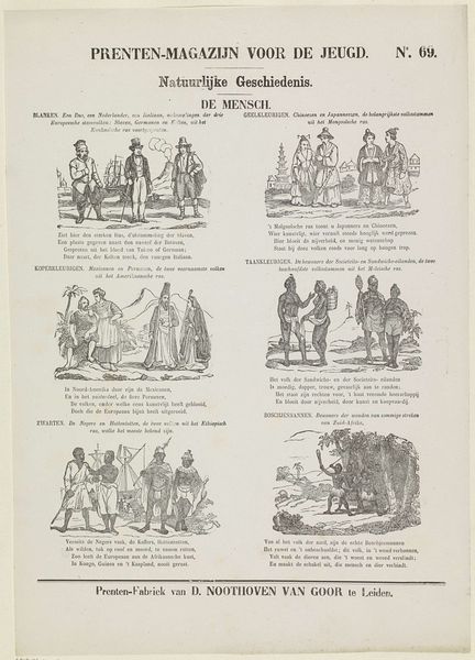 Editor: This is "Verschillende taferelen" from 1873, made by De Ruyter & Meijer. It’s a print composed of a collection of small ink drawings showing everyday scenes. I’m immediately drawn to the snippets of text accompanying each vignette; it makes me wonder about their connection to each scene. How would you interpret this work, considering its form and content? Curator: Well, the use of the printing press allowed for distribution to the masses, and therefore also to children and their educational experiences. When considering art of the 19th century we can’t forget that this piece can reveal societal values regarding children's roles, activities, and education. Looking at how the children are portrayed in relation to adults, do you notice a sense of instruction and authority present? Editor: Yes, in almost every panel, an adult seems to be either guiding or watching over a child. It speaks to a very structured, almost didactic approach. Do you see a critique of that approach here? Curator: That's an astute observation! While these scenes appear innocent on the surface, remember we must situate the work within a broader narrative of societal control and expectations during that era. This work presents itself as an educational piece, but perhaps through this structure, it’s inadvertently revealing the restricted lives of children, limited by adult supervision and didactic instruction. Do you feel that tension between celebration and potential critique of societal norms? Editor: Definitely. I hadn't initially considered that the seemingly innocent nature of these scenes could hint at a more complex commentary. Seeing them as a reflection of societal expectations, and potential limitations placed on children, shifts my understanding completely. Curator: Exactly! These small genre paintings may highlight daily scenes of the period but can offer us so much more on childhood experience once we apply lenses related to sociology and cultural studies.