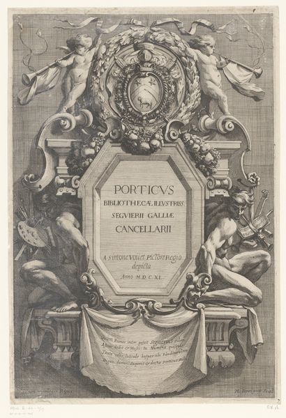 Editor: This is Francesco Carradori’s “Istruzione elementare per gli studiosi della scultura,” or "Elementary Instruction for Students of Sculpture," from 1802, an engraving printed on paper. It feels like a portal into another era of artistic learning. What symbols or historical references do you find most striking in this piece? Curator: What immediately grabs me is the symbolic language embedded within the seemingly simple illustration. The three women at the base, almost like the three graces, actively engaging with the portrait. To me, they suggest the journey from raw talent to refined artistry, where dedication allows you to learn from the past masters and create new perspectives. The title is enclosed by what almost appears to be an elaborate monument. What’s your interpretation of the reclining figure at the very top? Editor: An angel figure perhaps represents the divine inspiration and aspiration inherent to the artistic spirit. Does it relate to the references of Italian Renaissance in the information that I see attached to this print? Curator: Precisely! This visual vocabulary directly connects to the Renaissance's re-exploration of classical ideals of beauty, harmony, and the value of history. By the 19th century, you see artists invoking history and symbolism as a visual language for cultural and artistic memory, but now with an air of scientific authority befitting of a textbook like this. Notice how the architectural structure that frames the text also creates an altar-like space for that central portrait of the royal patron, emphasizing knowledge’s sacral status and the patron’s role in facilitating the arts. It suggests that education, artistic training, and the divine spirit are intertwined with history and authority. Does this piece make you rethink the connections between art, power, and the past? Editor: It absolutely does. It shows how deeply knowledge is linked with power and history and how the visual elements come together. I will think of all those relations next time I study art. Curator: It is wonderful to be aware of such a depth of interwoven references. This way we can be more sensitive to the cultural memory that resonates through imagery.