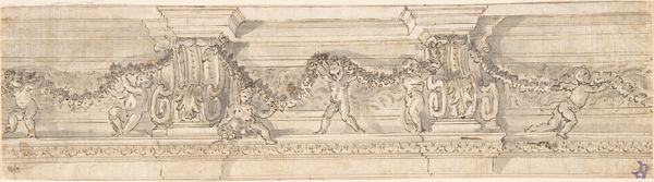 Curator: This is "Fries met putti en dieren", or "Frieze with Putti and Animals," dating from between 1768 and 1786. It’s a drawing rendered in ink, meant to evoke the effect of a carved relief. Editor: The linear quality gives it a restrained elegance. I notice how the sepia ink unifies the forms—figures, foliage, the ornate border—creating a harmonious flow across the entire frieze. It almost seems to dance before your eyes. Curator: The continuous narrative definitely invites that sort of sweeping, continuous reading. Note the recurrence of putti alongside various animals, likely symbolizing different virtues or perhaps echoing popular allegories from the period. It speaks to a desire to embody a harmonious relationship between mankind and the natural world. Editor: The use of line weight also provides a beautiful structure, wouldn't you say? Thick lines delineate the figures, bringing them forward, while delicate strokes render the foliage, giving depth. Look at how the consistent directional strokes bring cohesion to the whole work, mimicking the direction a chisel might move when sculpting. Curator: The image clearly references classical motifs, like the putti that evolved out of depictions of Eros. However, there’s a playful quality here too; they aren’t enacting any heroic scene but instead seem to interact casually with the animals. This points to the 18th-century re-engagement with antiquity that incorporated a lighter touch. Editor: I wonder about its intended context. Was it a design for a sculptural program or something intended as autonomous work? The interplay of light and shadow that's achieved simply through line is fascinating; in this way, the drawing possesses a sculptural sensibility of its own. Curator: I see this piece as speaking to its era, where the embrace of classical forms didn't require abandoning playfulness or personalized expression. It hints at a period that desired both refinement and ease. Editor: I agree entirely; it’s an object that carries classical and original qualities in a compelling equilibrium. It has structure but also whimsy.