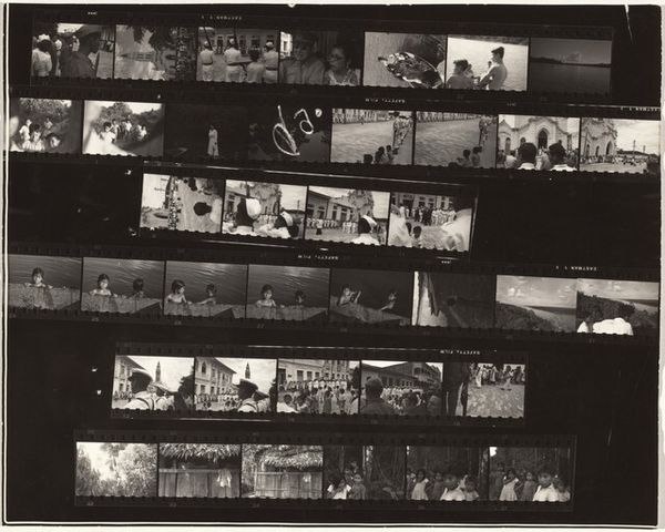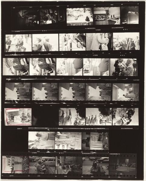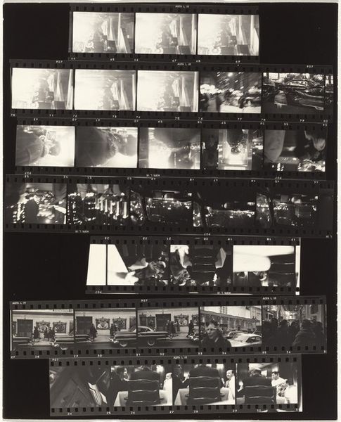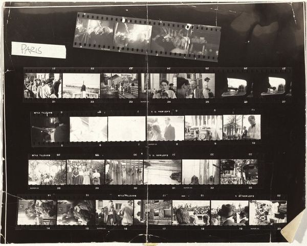 Editor: We're looking at "Pablo A" by Robert Frank, taken in 1953. It's a photographic work presented as a full film strip, so it feels very raw and immediate. What formal qualities strike you most in this piece? Curator: The composition commands immediate attention. Frank's use of the entire film strip, complete with sprocket holes and frame numbers, dismantles traditional photographic presentation. It compels us to consider the materiality of the medium itself. Observe the high contrast; the stark blacks and whites create a visual rhythm, guiding the eye across the disparate images. Editor: So, you're drawn to the way he presents the *film* as art, rather than just the images *on* the film? Curator: Precisely. The semiotic weight of the film strip as object cannot be ignored. Each frame functions almost as a unit of meaning, yet the sequence itself resists a singular narrative. Consider the repetition of certain motifs – the human figure, the urban landscape. What potential structures do you see emerging from this interplay of form and content? Editor: I see how the arrangement creates a new context for each picture...it's like a visual poem where the meaning shifts with each image. Do you think the imperfections in the film itself -- like the scratches -- add to that effect? Curator: Indeed. They become integral to the artwork, emphasizing the physical reality of the photographic process. Through a structuralist lens, these so-called "flaws" highlight the arbitrary nature of artistic representation itself, opening the work to varied interpretations. Editor: I see what you mean. Thinking about the materiality changes how I read each photo...I learned a lot about reading images formally through your viewpoint! Curator: Likewise. Attending to those minute compositional decisions enhances our appreciation for the work’s artistic structure.