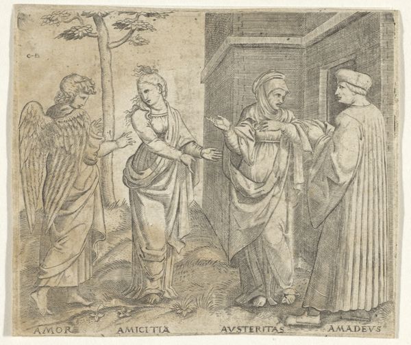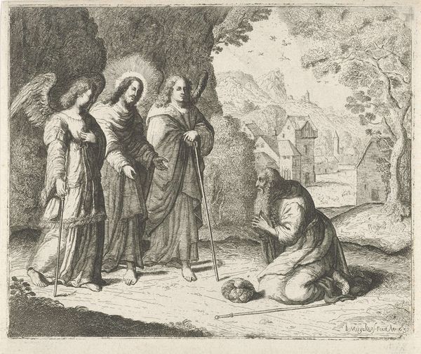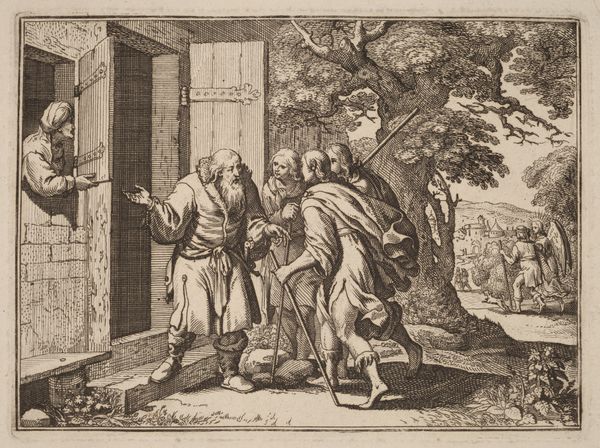 Editor: Here we have Sisto Badalocchio’s etching, *Jakob en Laban met Lea en Rachel,* created around 1607. There's a clear narrative quality to this, with the figures posed dramatically against a landscape. What's your take on its historical significance? Curator: Well, looking at this etching, what immediately strikes me is how Badalocchio navigates the visual politics of religious imagery at the time. Consider the historical context: the Counter-Reformation was in full swing, and there was intense scrutiny of artistic depictions of biblical scenes. How does this image engage with those concerns, do you think? Editor: I suppose by presenting it as almost a casual scene, like a sketch from a sketchbook, the etching seems to avoid the grandiosity often associated with religious works, thereby circumventing some of the stricter interpretations of appropriate religious art. Curator: Precisely! The format – an etching, with its inherent qualities of line and tonal variation – contributes to this effect. The turn to printmaking allowed artists like Badalocchio to disseminate these narratives more widely, bypassing some of the established power structures of patronage and display associated with larger-scale paintings. It’s about accessibility, both visually and socio-economically. Editor: So, it’s not just a biblical scene; it's making a subtle commentary on art's role within the church and society? Curator: Exactly. The very act of choosing this moment from the Jacob story, and presenting it in this medium, speaks to a desire to democratize religious narratives, placing them within a more accessible, perhaps even domestic, sphere. The sheep on the left could even function as an argument for art in everyday life, almost like domestic icons in a byzantine iconographic. Editor: I never considered the dissemination aspect and the power dynamics involved. That really changes my perception of the image! Curator: That’s the joy of art history: to consider not just what is depicted, but also how and why it’s being presented at a specific historical moment.