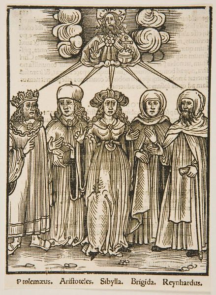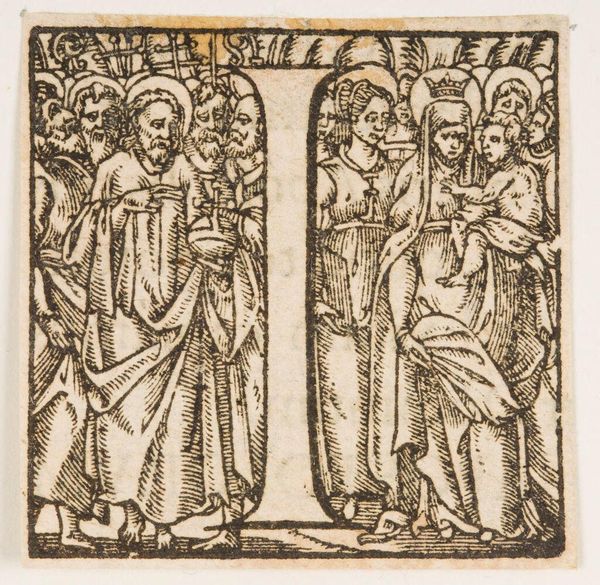 Curator: This woodcut, titled "Letter C", is by an anonymous artist and is currently held in the Harvard Art Museums. Editor: It looks like a secret society crowded inside a letter! All those robes and halos give it a strangely serious, almost forbidding air. Curator: The initial "C", framing the figures, suggests ideas of community and shared identity. Notice how the artist uses line and shadow to distinguish their distinct roles and expressions. Editor: Yes! And the halos practically scream "sacred authority", don't they? I see hints of palm fronds in the background, which evokes a sense of ancient tradition. Curator: Palm fronds often represented victory or eternal life, frequently associated with early Christian martyrs. Symbols such as these reinforce concepts central to faith during its time. Editor: You know, this feels like a coded message, a cultural artifact that contains layers of hidden meanings. Curator: Indeed, an image can be viewed as a portal to understanding both past and present. Editor: Right, so it's not just a letter, but a tiny universe packed with significance.