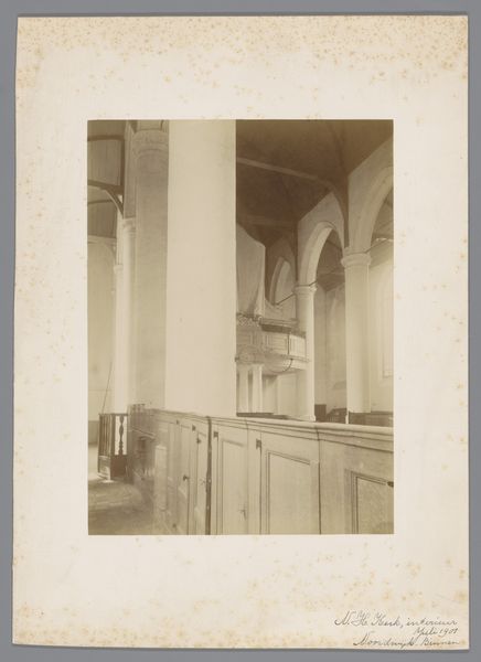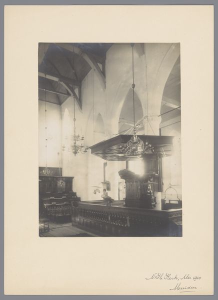This photographic print of the Sint-Pieterskerk in Utrecht, was made in October 1910 by an anonymous photographer for the Dutch Office for Monuments. What strikes me first is the subdued palette, almost monochrome. It’s like a painting where the artist has mixed a little black into every color, creating this unified, muted atmosphere. The texture seems smooth, almost velvety, which contrasts with the architectural subject matter. Look at the columns, how they rise into the light, fading gently. It's like the photographer wanted to capture the essence of the space, the feeling of standing there, rather than just documenting the scene. This approach reminds me a bit of Whistler's nocturnes, where the atmosphere and mood take precedence over the details. Both seem to say that art is not just about what you see, but how you see it.