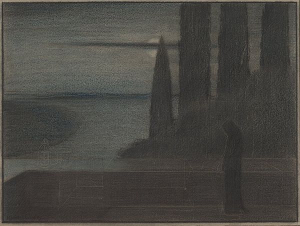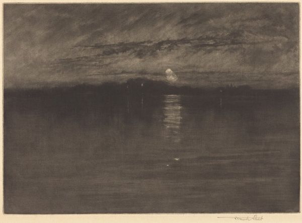 Curator: At first glance, it's almost all darkness—broken only by a few hazy glimmers. There's a strange calmness despite the gloominess of it all. Editor: You're observing James Abbott McNeill Whistler's "Nocturne," an oil painting completed around 1877. What’s particularly compelling here is Whistler's approach to depicting the urban environment, specifically London, under the cloak of night. Curator: Right, he doesn't so much depict a city, as distill a mood through his compositional choices. Notice how he prioritizes these almost tonal arrangements? The texture appears remarkably thin and uniform, even ethereal. Editor: It’s impossible to discuss this work without acknowledging its fraught public reception. Ruskin’s famous libel case stemmed directly from his accusation that Whistler was asking too much money for, essentially, "flinging a pot of paint in the public's face." This idea of finish, or the appearance thereof, spoke directly to a changing cultural landscape valuing industry. Curator: Interesting that you bring up the issue of labor in art production, especially within the framework of the Aesthetic Movement, where Whistler places utmost importance on beauty as an end in itself. I can appreciate the subdued, almost monochrome palette that conveys a powerful atmosphere with what appears to be minimal effort. Editor: It also shows a significant departure from earlier, more topographically accurate landscape traditions. Whistler transforms the Thames into something more abstract—a play of light and shadow that aligns more with musical arrangements, or nocturnes. He elevates an everyday industrial landscape to something poetic. Curator: So, rather than documenting reality, "Nocturne" attempts to evoke a sensorial experience? He captures a fleeting moment through pure tonal relations. It moves beyond representational accuracy. Editor: Precisely, and it pushed the boundaries of what was acceptable to the public as “art” at the time. Whistler wasn’t just painting a picture; he was crafting an experience, an aesthetic encounter meant to be felt as much as seen. The ensuing controversy only cemented his reputation as a provocateur. Curator: So, while seemingly serene, “Nocturne” holds within its murky depths a radical departure from artistic convention, it serves as a poignant reminder of how perceptions can be reshaped, challenging viewers to find beauty where it's least expected. Editor: And to me, a reminder that art can spark meaningful societal dialogues beyond the canvas. Thank you.