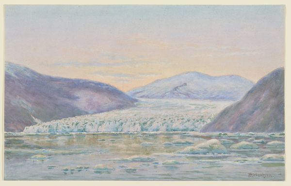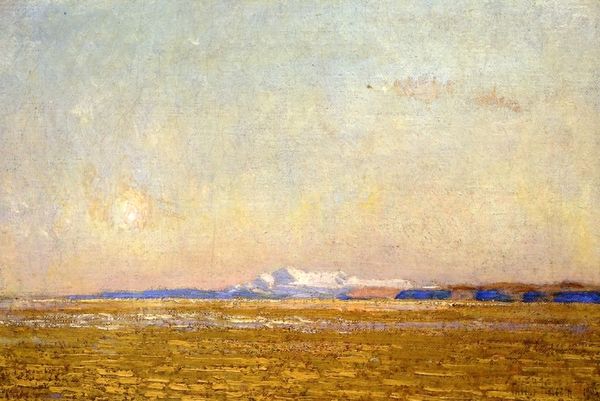Curator: This watercolor and oil painting, “Maggia Delta before sunrise”, was completed by Ferdinand Hodler in 1893. Editor: The colors strike me immediately; the whole scene seems to be awash in this pre-dawn light. The sky and water share this kind of soft, diffused yellow. Curator: It is certainly about light and place. Hodler was Swiss, and this piece exemplifies his effort to capture something quintessentially Swiss about the landscape. Editor: Yes, there's something distinctly topographical in how he captures the mountains in the background and the textures of the rocky riverbed. His organization and geometrical mirroring really speaks to me. Curator: Some critics link his approach here to his political sensibilities. They believe Hodler, as a Swiss artist during a period of increasing national self-consciousness, wanted to create a visual language for Swiss identity. Editor: You see this as Hodler trying to capture Switzerland's cultural and national consciousness? Curator: Yes. The meticulous rendering of the landscape and clear tonality could be interpreted as an effort to portray a clear, coherent, and idealized vision of the nation. This location was one he loved. The geometric repetitions might mirror social unity. Editor: It's true the careful composition and subdued color palette evoke a sense of serenity and order. The brushstrokes also look calm, like soft deliberate taps, almost reminiscent of Pointillism, giving the painting a tactile quality. Curator: I think Hodler’s approach resonates differently depending on our current sociopolitical frameworks. His artistic vision raises questions about representation, identity, and belonging, but through a focus on this one specific location at dawn. Editor: This analysis gives me an entirely fresh outlook. It's rewarding to observe how such careful brushwork and compositional balance can simultaneously exist within a loaded conversation around culture and society. Curator: Absolutely, and perhaps this intersection is the very thing that makes this landscape enduringly interesting.