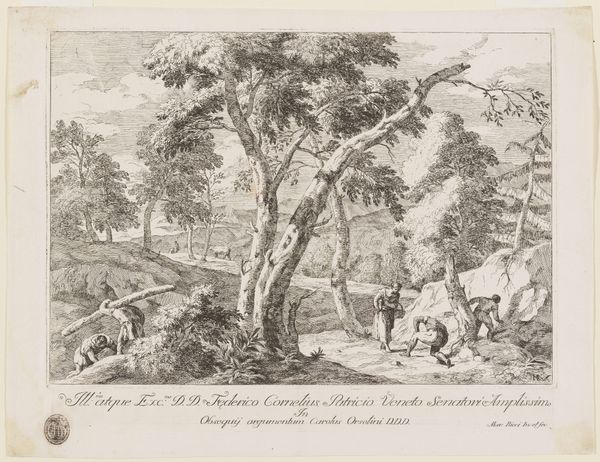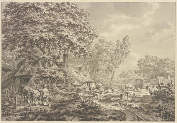 Editor: So, this is Johann Christoph Erhard's "On the Canal in Vienna" from 1819. It's an etching. I’m immediately struck by how much is happening. There's this wonderful detail in the figures and the trees, but there's also a feeling of everyday life, sort of like a snapshot. How do you interpret this work? Curator: From a historical perspective, it’s a fascinating glimpse into the Biedermeier era. While revolutions and Napoleonic wars raged elsewhere, Vienna enjoyed a period of relative peace and focus on domestic life. Etchings like this served as a way for people to circulate images and information about local landscapes. Does this suggest anything about the society which would cherish it? Editor: Definitely! It seems like a way for people to connect with their surroundings and build a sense of local identity. I mean, imagine not having photography – an etching like this becomes so important. Curator: Exactly. The romantic interest in the landscape is channeled into something specifically Viennese and shareable. Also, consider the burgeoning middle class. This isn't high art for aristocrats. This etching would be much more accessible and speaks to their growing social and economic influence. This affects its reception in powerful ways. How do you see that affecting how the landscape itself is shown? Editor: That makes so much sense. Maybe the details I mentioned earlier – like the people working or traveling – become important because they show life as it's actually lived by regular people. They want to see themselves reflected. Curator: Precisely. The seemingly mundane activities of canal life gain significance by becoming visible and validated as subject matter for "art". Also, observe that buildings are faintly shown in the background. It connects to the tradition of grander landscapes but domesticates that by filtering through the everyday life occurring on the canal. This makes it relatable. Editor: Wow, I never considered the political and social impact of just choosing a seemingly ordinary subject. Now it all clicks! It’s much more complex than just a pretty picture. Curator: Exactly, understanding the cultural forces at play makes these images come alive! It provides a richer appreciation, no?