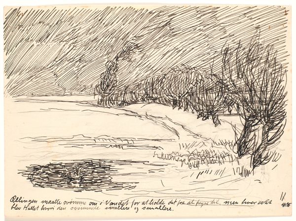 Editor: Lovis Corinth's "Walchensee in Winter," created around 1923, is a landscape print. It's stark. The dense, dark lines give a brooding and almost oppressive feeling. How do you interpret this work, considering its historical context? Curator: The oppressive feeling is key. Corinth made this in the wake of World War I, a period of profound disillusionment. Consider the societal trauma; Expressionism often grapples with anxieties around modernization, industrialization and of course the brutality of war. Editor: So the bleakness isn't just about the winter scene? Curator: Precisely. The landscape becomes a mirror reflecting a society struggling with loss and uncertainty. What is represented by the density of lines and harsh marks in the image? Editor: They could show chaos, lack of control, and overwhelming despair? Curator: Absolutely! Notice also how the perspective feels skewed and distorted. Expressionism sought to express inner emotional realities rather than objective visual truths. The simplification and abstraction are deliberate choices. How might these choices act as resistance? Editor: By challenging conventional beauty, maybe he is refusing to sugarcoat the truth about the suffering of the time. Curator: Exactly. It invites viewers to confront uncomfortable realities, pushing for empathy and, perhaps, social change. What do you think about expressionism's role in critiquing social structures of its time? Editor: This makes me view the Walchensee differently, beyond its aesthetic value, seeing it as a commentary on a society struggling to rebuild. Curator: That’s right. The context truly enriches the work.
