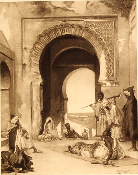 Editor: So, here we have Arthur Melville’s “Cock Fight,” from 1900, painted in gouache and watercolor. There's this fascinating blurry effect; almost like the memory of a scene rather than a crisp depiction. What symbols do you think Melville uses to tap into a deeper meaning, going beyond just a depiction of this event? Curator: Melville is certainly playing with the viewer's understanding of Orientalist tropes. Notice how the blurred figures almost blend into the architectural space. They are figures of anonymity, their identities veiled by the brushstrokes. What kind of emotions does that stir? Do you feel that anonymity adds to the tension or diminishes it? Editor: I think it’s unsettling, like the crowd itself is part of the ritual, and the two fighting cocks in the center feel even more isolated by the muted figures around them. Curator: Precisely. Melville uses this kind of anonymity to comment on cultural participation and spectacle. Think about the history of cockfighting itself. What comes to mind? Is it merely animal cruelty, or something more? The act becomes emblematic of broader social tensions and perhaps male aggression – symbolically, not just literally. The roosters stand in for human desires acted out by proxy. Editor: That's fascinating, seeing them as symbols instead of just creatures in a fight. It changes my perspective on the whole composition. I appreciate understanding that these blurry people almost symbolize anonymity or unspoken tensions more broadly than initially understood. Curator: Yes, exactly, understanding how this piece communicates cultural memory allows us to connect it not only to its time but to understand that it has psychological and historical context and meaning far beyond its basic visual elements.