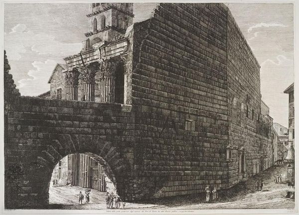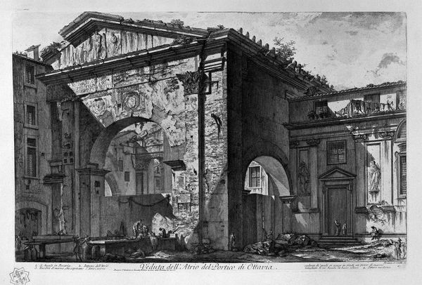 Editor: Here we have Piranesi's "View the remains of the Forum of Nerva," an etching. The sheer scale of the architecture, even in ruin, is quite impressive. What stands out to you about this work? Curator: I see Piranesi grappling with the material reality of Rome’s transformation. Notice how the printmaking process itself - the precise lines, the laborious etching - mirrors the way these massive stone blocks were extracted, shaped, and assembled. It’s about labor, isn’t it? Both the ancient Roman builders and Piranesi’s own artistic labor. Editor: That’s fascinating. I hadn’t considered the printmaking process as a form of labor parallel to construction. How does that reading influence the way we view the crumbling ruins? Curator: The ruins are not just romantic remnants; they’re evidence of a lost mode of production, a different way of organizing society and its resources. Look closely – those stones weren’t magically placed there. We're seeing the consequences of intense physical effort, the kind that built empires, and the effects of subsequent decay and reuse. Editor: It almost makes the Forum of Nerva seem like a quarry, where time and social changes are continually reshaping its material. Curator: Exactly. Piranesi isn't just presenting a picturesque view; he's subtly reminding us of the cycles of material use and reuse. Rome wasn't built in a day, and it certainly wasn't abandoned overnight either; each successive civilization alters it, consumes it, rebuilds with its remnants. Editor: I am now looking at this piece with completely new eyes. Seeing it as less of a history lesson and more about process of creation, destruction, and labor is a refreshing lens. Curator: Yes, and consider the social implications. Who benefited from that labor? Whose hands shaped those stones, and to what end? Engaging with those questions makes this print resonate far beyond its depiction of Roman ruins.