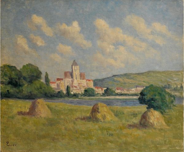 Maximilien Luce made this painting of Méréville in oil on canvas using pointillist techniques. It’s like he built the scene from a bunch of tiny color notes. Look closely, and you’ll see how the surface is alive with dabs of paint. The color mixing is all optical, happening in your eye as you see the relations between one hue and the next. The pinks and greens in the field vibrate against each other. There’s a real emphasis on materiality; he’s not hiding the paint or trying to make it look like anything else. I particularly love the big green tree near the tower; it feels so solid and present. I see connections between Luce’s process-oriented approach and someone like Van Gogh, who also used visible brushstrokes to build up form and space. But Luce’s embrace of systematic color theory gives his work a more measured, almost scientific feel. It’s a reminder that art is always a conversation between feeling and thought, chaos and order.