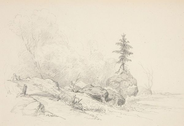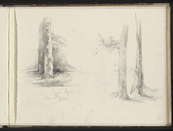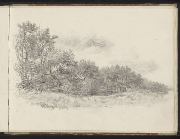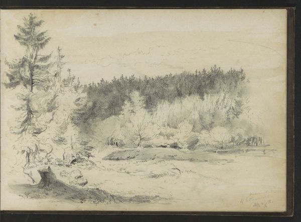 Curator: Looking at this delicate pencil drawing by Willem Cornelis Rip, entitled "Naaldbomen bij Beek", or "Pine Trees by the Creek," created sometime between 1874 and 1878, I am immediately struck by its hushed, almost ethereal quality. Editor: There's an undeniably calming atmosphere. The soft, light strokes lend the scene an air of quiet contemplation. It almost feels like looking at a memory of a forest rather than the forest itself. I wonder how that atmosphere relates to ideas around Romanticism and representations of nature at that time? Curator: Rip's adherence to Romantic ideals of nature is really clear when considering this delicate, seemingly untouched forest; it reflects the prevailing reverence for the natural world so prominent at the time. But also how these images contributed to national identity. This specific kind of scene plays into the narratives surrounding Dutch cultural heritage during that period. These idyllic images also obscure potential inequalities within representations of the Netherlands, wouldn't you agree? Editor: Absolutely. The choice to depict this secluded, pristine scene excludes human presence, perhaps subtly reinforcing a specific, elite vision of the national landscape—one where ownership and access may not have been universally shared. By the late 19th century, artists were already contesting these picturesque traditions. Curator: The almost photographic realism enabled by pencils gives immediacy. This closeness gives this sense of intimacy and direct experience. Editor: Indeed. Considering the time, the material speaks of both privilege and artistic commitment. The accessibility and affordability of pencil drawings allowed a wider segment of the artistic population to practice landscape art, even though these works would likely still find an audience within the elite. Curator: And despite the subtleties, one can feel its connection with the Northern Renaissance style too. In Rip’s artwork there is an acute observation of natural forms with such precision, just like they favored. Editor: Looking at it now, I realize how much I appreciate these landscapes being presented through a progressive critical eye. Curator: Examining how images can also participate in conversations around nationalism or inclusivity, shifts its meanings into the future.