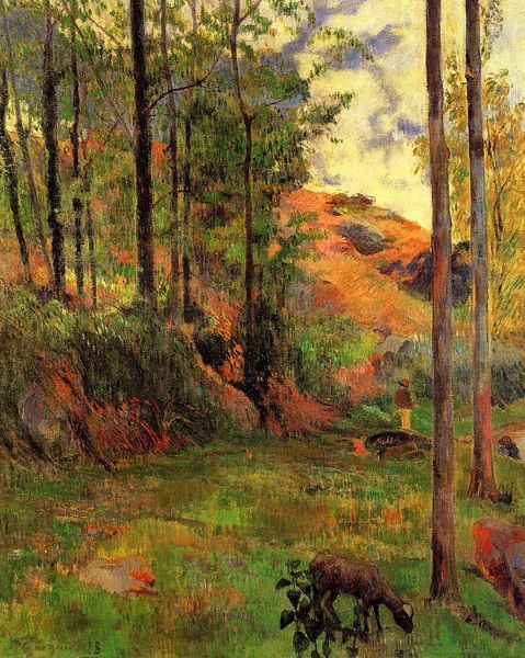 Art Historian: Welcome. Before us hangs "Girl in White in the Woods," an 1882 oil painting by Vincent van Gogh. It resides here at the Kröller-Müller Museum. Curator: The palette is immediately striking! Browns and oranges dominate. A single figure, presumably the 'Girl in White,' stands at the forest's edge, creating a dynamic contrast with the densely packed trees. There’s a peculiar glow, a somber sort of energy about it all. Art Historian: Van Gogh painted this while in The Hague, during a period when he was struggling financially and emotionally. His artistic development was greatly influenced by his mentor, Anton Mauve, who introduced him to painting "en plein air" which means 'in open air.' We believe Mauve possibly assisted with the female figure here. This artwork serves as one of Van Gogh's earliest forays into Impressionistic landscape. Curator: Yes, but I find it intriguing how the impasto—the thick application of paint—draws the eye across the canvas. The textures seem to evoke the rawness of nature. Consider the brushstrokes. Notice how they animate the woodland floor with such vigorous movement. But the placement of the girl is what perplexes me. Is she part of this landscape, or strangely apart from it? Art Historian: Some historians argue she represents societal expectations pressing on young women at the time, placed against nature's raw freedom, although no known documented claim validates it. What is visible in this image are elements he absorbed from The Hague School; this influence appears through a subdued palette mirroring much of Dutch art. Van Gogh intended to express feelings associated within nature instead presenting beauty alone. Curator: While such social context is fascinating, purely visually she creates tonal disruption. I disagree the tones harmonize seamlessly; those whites clash delicately beside saturated hues causing imbalance—or intended emotional resonance beyond color theory itself, what’s your perception perhaps? Art Historian: True. Yet her positioning, deliberately contrasted against earthy shades invites inquiry not simple appreciation: Is there intention within how Van Gogh wishes others visualize contemporary lives through environment. In the context for the Dutch Art society during that century one does see elements representing social values as well landscape depictions within everyday themes; his integration makes work invaluable given limited success experienced until well after life’s close! Curator: Van Gogh pushes conventional art parameters of perception toward emotion. By emphasizing texture together compositional balance he challenges observers even present day! It feels intensely immediate something to be not objectively admired something one feels; simply unique from art norms generally seen back now! Art Historian: Perhaps… in understanding struggles the painting embodies becomes both portrait environment… it prompts introspective recognition despite passage after one! A relevant work despite shifts occurring culture technology. Curator: Perhaps; what lingers afterward is that unforgettable interplay with color which shapes how viewer interfaces intrinsically regardless further insight history may ever furnish.