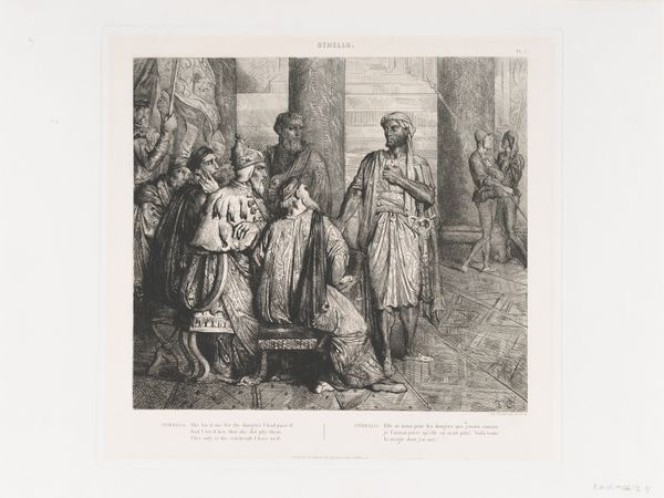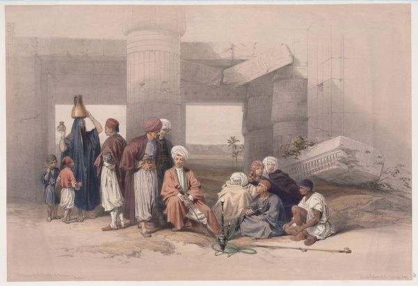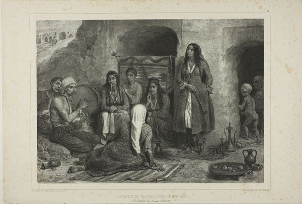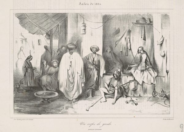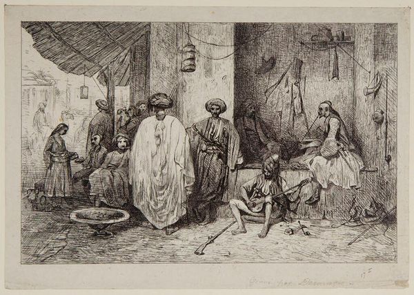 Curator: This is Alexandre-Gabriel Decamps' "Turkish Guard House," created in 1834. It's a print, an etching on paper, currently residing at the Art Institute of Chicago. The cross-hatching and dense composition definitely capture a busy scene. I'm curious about how the artist used line to define space and depth here. How do you interpret this work, based on these compositional choices? Editor: It strikes me as chaotic, but deliberately so. The artist’s technique, the intricate lines and overlapping forms, feels like it's meant to reflect a vibrant, active environment. The scene is bustling. I see a central gathering of figures framed on the left with supporting figures and architecture around the background edges, leaving some negative space for the background details. How does this inform the relationship with space? Curator: The composition certainly lends itself to an interesting exercise in the visual structure of a contained space. The interplay between foreground and background is subtly handled, don't you think? Note how Decamps uses the etching technique itself -the density of line- to define form and spatial recession. The textural richness contributes to the overall effect of a vibrant space. This etching demonstrates an attempt to resolve planar ambiguities between what should come forward, versus what sits in the shadows. Do you notice the formal symmetry this compositional element helps generate? Editor: Yes, I think I see that! The weight distribution feels deliberately balanced, especially considering how asymmetrical it seemed at first glance. So, rather than aiming for realistic depth, he seems more concerned with the textural density and overall pattern created by the etching? Curator: Precisely! And the artist uses these elements to draw your eye around the whole piece. Line is contour and content, wouldn’t you agree? Editor: That’s a great point; thinking about the linework as the literal foundation of the work makes me appreciate it in a completely different way. Curator: Indeed, analyzing the work in terms of form can bring us much closer to understanding its structural content, it becomes almost a construction to be deconstructed to see it clearly.