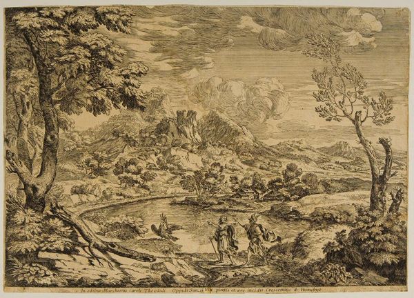 Titian created this print, "The Submersion of Pharaoh's Army in the Red Sea," sometime in the 16th century. The composition is divided, pitting foreground figures against the background chaos of the parting Red Sea. The stark lines carve out a narrative space, separating the Israelite onlookers from the tumultuous fate of Pharaoh's army. Note how the linearity of the waves mirrors the rigid ranks of soldiers being engulfed, suggesting a structured inevitability to the divine intervention. Titian masterfully uses line and texture to create a sense of depth and drama. The scene echoes contemporary debates about divine will and human action, questioning where agency lies when confronted with seemingly pre-ordained events. Is the parting of the Red Sea a metaphor for humanity's struggle against unstoppable forces? Ultimately, Titian's calculated construction invites us to contemplate the formal elements that underscore complex theological and philosophical questions, provoking ongoing interpretation.