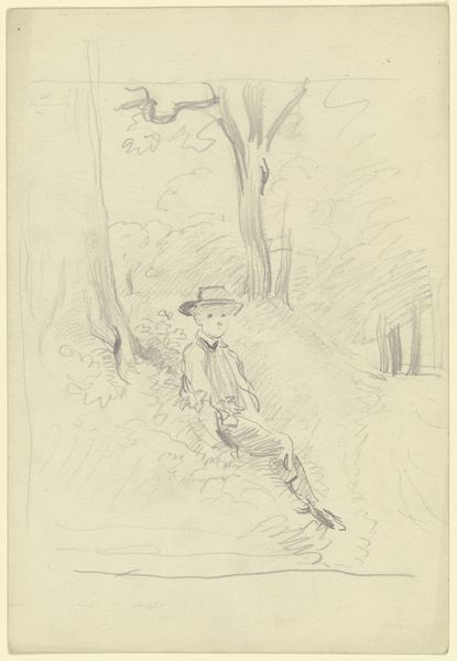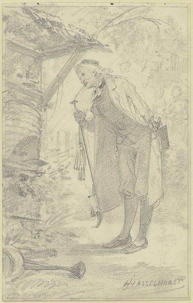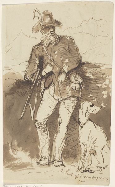 Curator: What a wonderfully relaxed drawing. I love the sense of a quiet moment it evokes. Editor: Indeed, it’s quite still. There’s a pensive mood about it for me. The use of sepia ink gives it an antique feel, making me consider ideas around labor and leisure in the mid-19th century. Curator: This drawing by Johannes Tavenraat, created sometime between 1840 and 1870, is titled "Hunter Leaning Against a Tree.” It is a piece housed right here at the Rijksmuseum. You’ll notice it’s primarily ink on paper. Editor: I am immediately drawn to the man’s pose. He looks almost melancholic as he leans against the tree. The gun next to him almost makes the viewer complicit. Curator: That is precisely the Romantic sentiment Tavenraat was capturing at the time. Think about the cultural image of the hunter: simultaneously solitary, masculine, and free, yet tied to labor, land and ideas of conservation. Editor: Conservation, or exploitation? I keep returning to his attire – that loose-fitting coat and hat, not necessarily designed for rugged activity, I’m questioning his connection to the working class? Curator: Tavenraat made his career by rendering landscapes. His style demonstrates an understanding of how one's surroundings shape the individual. I would suppose this drawing is rooted in the period's fascination with nature and representations of social types. Editor: Representations that serve certain socio-political functions, perhaps? Is the image intended to celebrate the hunt as a noble tradition, even for the "everyman"? The hunter's placement in the composition—somewhat central—suggests a celebration of rural life. Curator: Or, conversely, this romanticized portrait could question changing views around the role of labor as industry shifts it into a less central, picturesque, part of civic life. What I admire about this particular work is Tavenraat’s loose handling of the ink that suggests immediacy in observation. Editor: Despite its conventional genre subject matter, I agree it possesses a captivating sincerity, capturing a unique and nuanced portrayal of 19th-century identity that still sparks meaningful dialog today. Curator: Precisely. And that's what makes a work worthy of reflection, even after all these years. Editor: Indeed, and these images serve as cultural documents worthy of deeper consideration in terms of history, identity and artistic tradition.