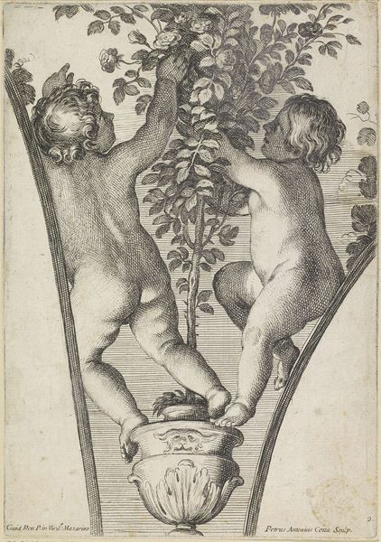 This print, by Luca Ciamberlano, dates back to the 17th century. Born in the late 16th century, Ciamberlano lived during a period of immense social and cultural change, as Europe emerged from the Renaissance. The print depicts two figures, a male and a female, with a classical aesthetic celebrating the idealized human form. Yet, how do these bodies reflect the complex interplay between gender and power within the historical context of early modern Europe? The male figure is presented as strong and virile, embodying traditional ideals of masculinity. On the other hand, the female figure, while also idealized, exists in relation to the male form, reinforcing societal expectations of femininity and gender roles. The artwork subtly reflects the politics of its time, reinforcing traditional power structures even while celebrating human beauty.