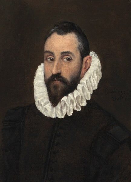 El Greco's Portrait of a Gentleman from Casa de Leiva at the MMFA presents us with a somber yet striking figure rendered in oil. The subject's dark attire sharply contrasts with the bright, intricately pleated ruff around his neck, immediately drawing our eyes to his face. The composition is structured by this contrast, the somber background against the light collar, which serves to frame the gentleman’s face, bringing the subject to the fore. There’s a distinct lack of embellishment, focusing attention on the individual. This austerity speaks volumes. The man’s gaze is direct, capturing a sense of self-assuredness, yet there is a touch of melancholy. El Greco masterfully uses color and light to convey both the external appearance and the internal state. The restrained palette and the emphasis on form over decoration align with the intellectual and spiritual climate of the period, challenging the ostentatious displays of wealth. This portrait reflects a deeper exploration of human character and the interplay between appearance and essence. The gentleman’s presence invites contemplation on the nature of identity and representation.