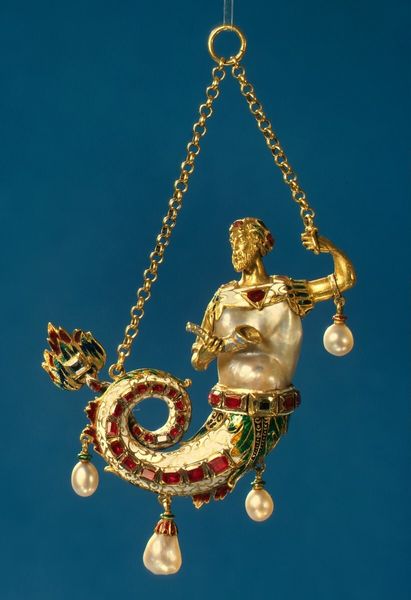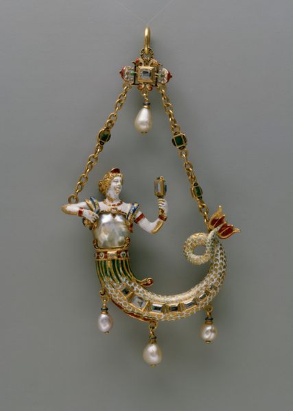Alfred André crafted this pendant with a mermaid using gold, enamel, pearls, diamonds, and rubies in the late 19th century. During this time, jewelry served as an outward display of status, reflecting both personal identity and social standing. André’s mermaid, caught between worlds, embodies the fluidity of identity and the power of transformation. The choice of a mermaid, a creature of folklore, allows for a challenge to traditional representations of femininity. We see the figure gazing into a mirror, seemingly self-aware, adorned with jewels and fine details. Are we, the viewers, looking at the mermaid, or is she looking back at us, scrutinizing the way we look at her? André's pendant invites us to consider the narratives we construct around identity, beauty, and the gaze. It leaves us to question how the tension between myth and reality shapes our understanding of ourselves and others.
