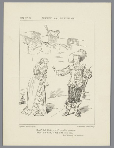 Editor: We're looking at "Spotprent op de redding van de Schutterijwet," or "Cartoon of the Rescue of the Militia Law," from 1867, by Johan Michael Schmidt Crans. It's a pen drawing, and there's a quirky sort of humor about it. The figures are so stylized! What do you see in this piece, that maybe I'm missing? Curator: Well, darling, first off, that gangly soldier looming over everyone… Doesn't he just scream "bureaucracy"? The way he's all rigid lines and impossible proportions – a true caricature of authority. And those two chaps scrambling in the muck? It looks like they are after the "modaille voor het redden van drenkelingen," so fighting over a medal for saving some poor, sozzled souls! Editor: Oh, so it’s satire! Curator: Precisely! It's about the militia law – "Schutterijwet" – probably up for debate at the time. I imagine Crans is poking fun at the scramble to save a failing system, using the imagery of a drowning… system. Or perhaps he questions the motives. Editor: I see it now. It’s so much more than just a funny sketch; it’s got bite. Curator: Absolutely! Art often disguises its most profound messages with a wink and a nudge. Made you look twice, didn’t it? Sometimes a personal sketchbook offers you something to laugh at, and at the powers that be too. Editor: I’ll never look at a "quirky sketch" the same way again. Curator: My dear, isn’t that the point? To always see beyond the lines and into the heart of the matter… even if that heart is dipped in ink and irony!
