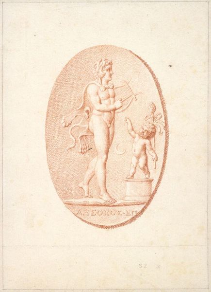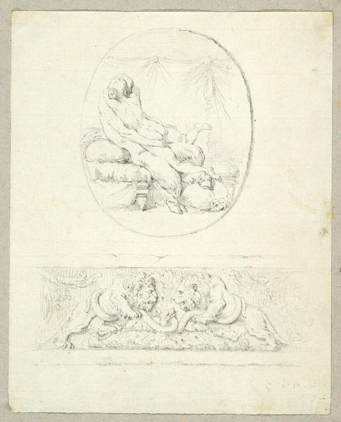 Curator: This is a graphite sketch by Jean-Honoré Fragonard called "Satyr and Maenad Embracing; Study for a Monument; Vessel". It’s really three drawings on one page. Editor: My first thought is that it feels quite academic and restrained for such an erotic subject. Curator: True! Fragonard may be softening the blow of these mythological scenes. A satyr and maenad, after all, represent unleashed passions, and look how neatly framed they are within that oval. Editor: Yes, and these controlled sketches speak to the complex relationship between desire and societal norms. Fragonard is both celebrating and containing it. Curator: And I think there’s something quite delicious in this—we know the wildness is there, but it’s being held back. Editor: Exactly. It reflects a period grappling with Enlightenment ideals and the enduring power of primal instincts. Perhaps those monuments were meant to contain those desires. Curator: It does feel like we're seeing his working process laid bare. Editor: And it reminds us that art is always wrestling with the tensions of its time.