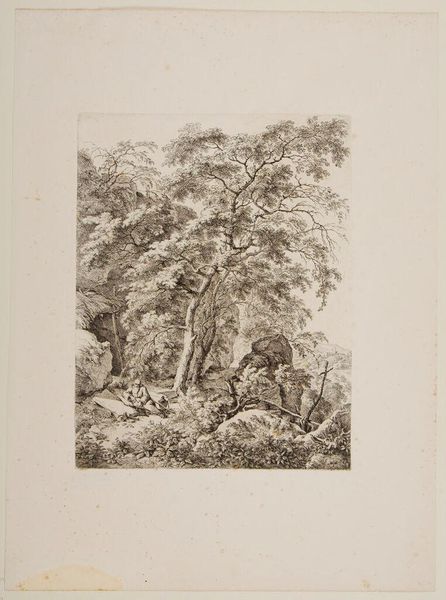 Editor: Ferdinand Kobell’s “Peasants Sitting on the Bank of a Stream," date unknown, presents a tranquil scene. The fine lines create an almost ethereal quality. What do you see in the composition of this work? Curator: I am drawn to the interplay of light and shadow achieved through the density and directionality of lines. Notice how the hatching technique sculpts form and defines space. Editor: It’s amazing how such detail is achieved without color. I hadn't considered the line work in that way. Curator: Indeed, the artist’s mastery lies in manipulating tonal values using only line, resulting in an intricate, almost architectural structure. What new insight have you gained? Editor: I now understand the significance of line work and how it defines the image's structure and tonality. Curator: Precisely, we learn to appreciate the work through such formalist analysis.