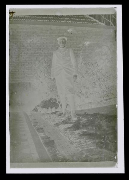 Curator: This is an intriguing gelatin-silver print attributed to Laurens Lodewijk Kleijn, entitled "Portret van een onbekende jongen op en grasveld, op de achtergrond een muziektent" - Portrait of an unknown boy on a lawn, with a bandstand in the background - dating from around 1865 to 1900. Editor: It’s incredibly atmospheric. There’s an almost ghostly pallor about it. The inverted tones play with light and shadow in a fascinating way. Curator: The boy's anonymity, coupled with the almost dreamlike quality of the photograph, begs the question: who was he? Photography at this time was still developing as a medium, often tied to notions of memory and memorialisation. Considering the historical context of high child mortality rates, is it a memorial portrait? Editor: Interesting point. The formal elements definitely contribute to that interpretation. The stark contrast enhances the sense of otherworldliness. The flatness almost removes depth. But structurally, the gazebo in the background provides a really pleasing compositional counterpoint to the figure. Curator: Absolutely. It makes me wonder about the social dynamics at play. Who had access to these new technologies, who could afford to document their loved ones in this way? How did class impact representations? Also, think about the presumed photographer, Laurens Lodewijk Kleijn, his class and potential access and power dynamic with the portrayed young man, maybe as a societal member from a well situated family. Editor: Beyond the social questions, it's amazing how much nuance Klein was able to achieve with the limited technology of the time. The range of values and the subtle gradations in tone are remarkable. It is an early landscape that captures the style of impressionism in its tones. Curator: Looking at this artwork, one is forced to meditate on issues of social standing and technological determinism, questioning who the picture fails to capture, and why. The gaze of the nameless youth becomes symbolic of all lost possibilities. Editor: For me, the image lingers, the semiotic weight is light. Curator: Yes, it stays with you, this haunting reminder of a past both familiar and distant. Editor: Precisely. And it keeps on intriguing as we gaze at it, looking for meanings that may or may not be there.