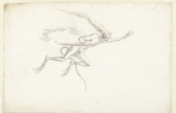 Curator: Before us is "Hertengewei en een liggende herder" – a pencil drawing by Johannes Tavenraat, dating back to 1840. Editor: It's striking how ethereal it feels, like a dreamscape captured in graphite. The composition, particularly the placement of the antlers against the figure, is quite dynamic despite the sketch's subdued tone. Curator: Precisely. Tavenraat’s deft use of line weight is evident, especially in rendering the texture of the antler’s surface. We can analyze the precise application of hatching and cross-hatching to produce shading and the three-dimensional qualities within this mostly tonal work. Note how the careful arrangement generates a symbolic counterpoint. Editor: Speaking of texture, what paper did he use? And the pencils... were these locally sourced graphite, influencing the subtleties of shade? This raw material dictated Tavenraat’s craft. Also, what were the economic pressures driving him? Was drawing more accessible than painting given material costs? These factors shape the narrative. Curator: These questions move beyond what’s apparent in the artwork's formal properties. Yet if we examine Tavenraat’s approach through the tenets of Romanticism, the visual dialogue between nature – symbolized by the antlers – and humanity can reveal its complex intellectual layers. This approach encourages interpretation within established visual syntax. Editor: The reality of creation is in how it was achieved and whom it represents. Let us imagine the material production of pencils available at this moment in time for a broader understanding of social constructs depicted through art history. And to that I must pose: Who was this shepherd, actually? What sort of labor filled his days? Curator: A reading through Realism grounds the subject further, while retaining an engagement with nature which the period held to elevated aesthetic standards, although one cannot discard a symbolic context. Editor: We come closer to appreciating the human conditions embedded in Tavenraat’s time and artwork once materiality and production get acknowledged – not just symbolism. Curator: I concur that its context contributes profound depth to understanding its form. Editor: Yes, by investigating what was available to be used, we truly grasp that art can exist from multiple social viewpoints within its formal structure.