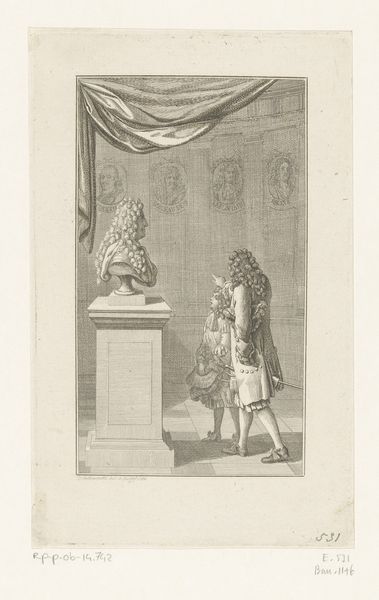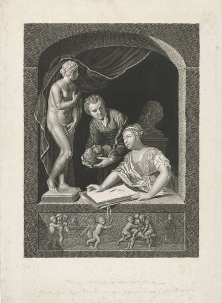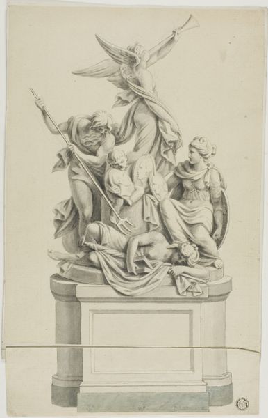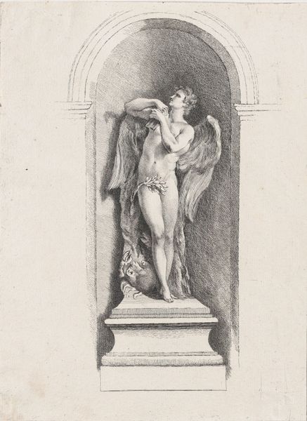 Editor: Here we have Claude Mellan’s engraving, “Minerva, leaning on a pedestal,” from 1637, housed here at the Rijksmuseum. I am struck by the allegorical composition and all the surrounding objects... What do you see when you look at this engraving? Curator: Immediately, I consider the context of its creation. Seventeenth-century art, particularly allegorical prints like this, functioned as visual rhetoric. Minerva, the Roman goddess of wisdom and strategic warfare, wasn't just a mythological figure; she was a symbol, often invoked to legitimize power, commemorate events, or advocate for particular policies. Mellan's depiction needs to be situated within that framework of political imagery. Consider, who was the intended audience? And what message was Mellan trying to convey? Editor: That makes sense. I noticed Minerva has a rather thoughtful expression. Could her posture tell us more about what this piece is meant to convey? Curator: Absolutely. Notice the placement of the pedestal and its blank front. Also, the instruments of war at the goddess’ feet contrast with the cupid extending a wreath. Minerva appears pensive, perhaps suggesting the careful deliberation required before engaging in conflict, but this doesn’t discount the relevance of weapons in political stability and triumph. This image can act as an encouragement towards a political strategy of caution but determination, likely toward political issues of the period. What’s your understanding? Editor: It feels like a complex statement. She embodies war but also contemplation and maybe even peace. The presence of the Cupid further supports the peace idea. Curator: Indeed, a successful image! It demonstrates how art from this period wasn't just about aesthetics. These images served a public function; they shaped opinions and reinforced societal values. Editor: It is remarkable to think how engravings like this functioned within the 17th century and continue to carry significant political weight. Curator: Exactly, examining Minerva, leunend op een voetstuk" illuminates the political work an image performs across the centuries, how the function of art lives on, as a socio-political lens!