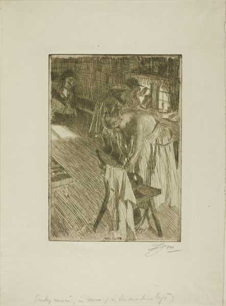 Théophile Alexandre Steinlen created this print, ‘Deux Gigolettes et Deux Gigolos’, using the etching process. This intaglio technique involves biting into a metal plate using acid, the lines of which hold ink and transfer to paper when printed. Look closely, and you can see the web of fine lines that define the scene. Steinlen scratched these lines into the metal, building up tone and shadow through their density and direction. The scene depicts two young women and two young men on what appears to be a Parisian street. Steinlen was very interested in depictions of the urban working class, and you sense a certain world-weariness in this print. The etching process itself – laborious and indirect – may be seen to mirror the experience of these figures in the industrialized city. Ultimately, it is the skillful manipulation of material and process that gives the image its social resonance. The print is not just a picture, but a document of how labor is represented, and made visible through a demanding creative process.
