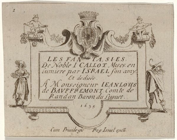 Editor: This is Jacques Callot’s "Frontispiece," made around 1633. It's a small etching, but the composition feels grand. What symbols do you see at play here? Curator: The arrangement speaks volumes. Note the title, "The Miseries and Misfortunes of War," framed by soldiers and instruments of war. It evokes a triumphal arch, yet the faces hint at weariness. What emotions do the drums and cannons conjure for you? Editor: A sense of foreboding, the glory of war masking its brutal reality. Curator: Precisely. Callot uses these symbols to explore the psychological weight of conflict, a cultural memory etched in the image itself. Have your perceptions shifted? Editor: Yes, I see the image as less celebratory and more as a commentary on the human cost of war. Curator: And that’s the power of symbols – they hold layers of meaning that unlock with deeper observation.