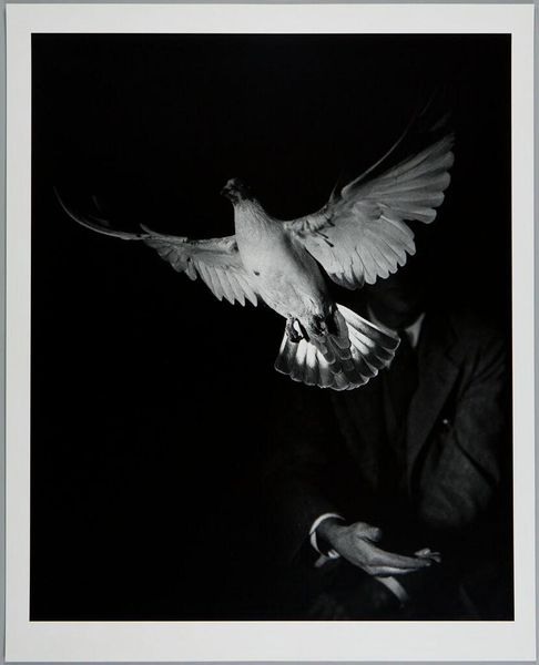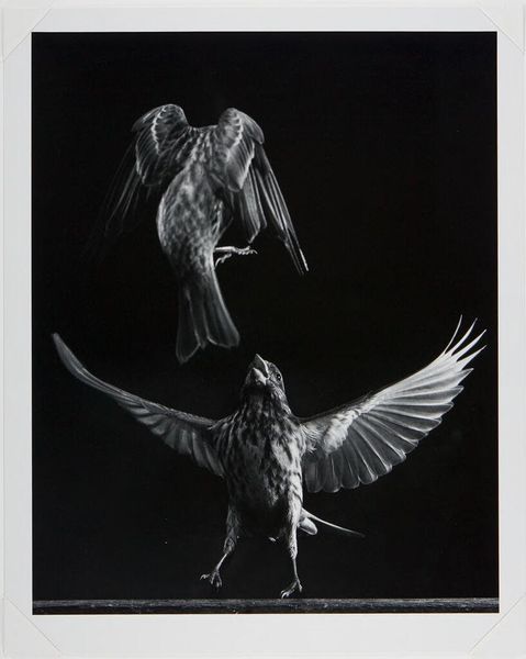 Curator: Harold Edgerton's "Anna's Hummingbird, Los Angeles" is a captivating black and white photograph. Editor: It's almost dreamlike! The bird is suspended against this stark background, wings outspread, like some sort of avian deity descending. Curator: Edgerton was known for his stroboscopic photography. He pioneered techniques to capture motion that was otherwise invisible to the naked eye, which revolutionized scientific and artistic fields alike. Editor: The hummingbird has always been symbolic of joy, healing, and adaptability. Capturing its wings frozen like this somehow intensifies that feeling. Is it freedom, or perhaps vulnerability? Curator: The photograph’s effect on the public was profound. It spurred appreciation for the natural world but also demonstrates the power of technology to alter perception and shift scientific understanding. Editor: I think its power lies in the mystery it preserves, even while revealing so much. Curator: A perfect intersection of art, science, and cultural impact, indeed.