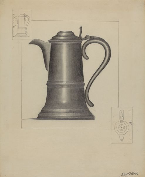 Editor: Here we have A. Zaidenberg's "Spark Lamp," a pencil drawing on paper from around 1936. There’s a quiet formality to it, almost technical. How do you interpret this work? Curator: That's a perceptive observation! It’s crucial to consider the context of the 1930s. We can ask, what purpose does this image fulfill? A detailed rendering of an object like this reflects an engagement with labor and manufacturing. Given Zaidenberg's background, the "Spark Lamp" potentially carries symbolic weight. It also evokes a strong relationship to domestic life, with a distinct gendered dimension. What statement might Zaidenberg be making through it? Editor: I see what you mean about labor, especially because the drawing itself seems to require careful labor to create! Could it simply be an appreciation of everyday technology? Curator: It certainly gestures towards that. But, as scholars, we must dig deeper. The very act of meticulously rendering a commonplace object elevates it, drawing our attention to its construction, its utility, and, importantly, its accessibility (or lack thereof) to different segments of society at the time. The presence of a smaller drawing depicting its measures might mean the illustration was done with functional purposes. Also, does the spark lamp have connections with historical figures who championed the cause of the worker class? Editor: That's fascinating; it gives me so much to consider! Thanks, I've never really thought about art in relation to labor like this. Curator: Exactly! Art opens conversations, makes connections, and reveals so much more when examined with social and historical lenses. This detailed exploration has changed the way I look at functional design.