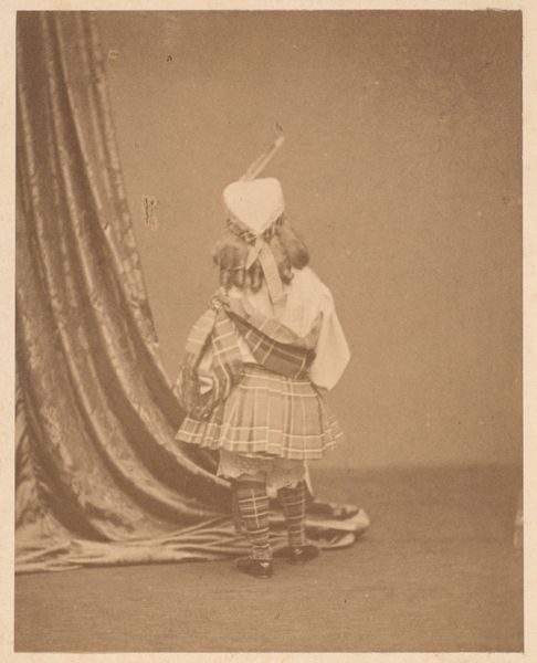 Kassian Céphas made this studio portrait of two Javanese dancers in traditional attire. The photograph's composition is striking: two figures are arranged almost symmetrically, their poised stances creating a dynamic balance within the frame. The textures captured by Céphas's lens contribute significantly to the image's allure. The intricate patterns of the dancers' costumes contrast with the smooth backdrop. The texture invites a deep visual dive, underscoring the rich cultural narrative embedded in their garments. Consider how Céphas employs light and shadow to define the dancers' forms, accentuating the sculptural quality of their figures. What might these choices suggest about the cultural values and aesthetic ideals of the time? The artwork challenges fixed ideas about identity, representation, and the gaze. It invites reflection on the complexities of cultural exchange and representation in colonial contexts.
