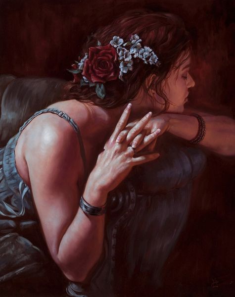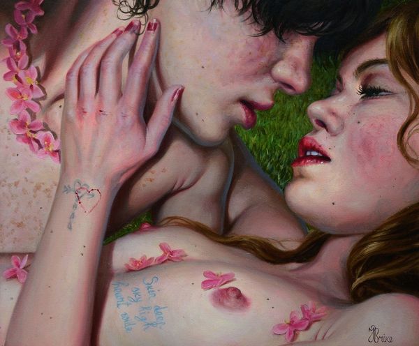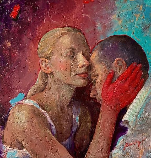 Editor: So, this is "And Then it Happened," an oil painting by Joseph Lorusso. The focus is on two figures in a very intimate embrace, their faces almost entirely obscured. It's intensely emotional and romantic, but also has a sense of vulnerability. What do you see in this piece? Curator: The figures certainly carry emotional weight. Think about the enduring power of the kiss in art history. It's not merely physical; it symbolizes union, desire, and sometimes even betrayal. What do their intertwined hands suggest to you? Is there tenderness? Or perhaps desperation? Editor: I see a bit of both, actually. The clasping could be supportive, but the pressure seems tight, anxious almost. Is Lorusso drawing from particular historical visual tropes, or...? Curator: Intimacy has always been explored in painting, particularly through portraits or genre scenes. Here, Lorusso seems to be consciously evoking the drama of Romanticism while updating it for a contemporary audience. The figures lack idealized features, they seem caught in a fleeting, unfiltered moment. Editor: That's interesting, like a captured, authentic moment. Are the clothes or hairstyles meant to signify anything beyond the present? Curator: While not explicitly referential, their plain clothing places them outside of specific temporal context, creating a sense of timelessness. This amplifies the universal themes of love, vulnerability, and human connection. Think about how the use of light contributes to this feeling. Notice the dark and light hues, how it draws our eyes toward the focal point: the figures. Editor: That makes sense. The use of light definitely focuses attention on their connection, making it feel immediate. It is almost like witnessing their private moment. Thanks! Curator: And thank you, this was revealing. Focusing on artistic interpretations deepens my own reading.