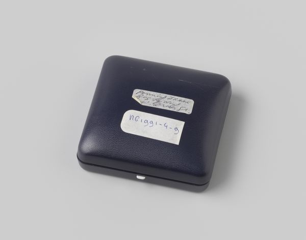 Editor: Here we have “Lint, blauw, aan beide zijden goud afgebiesd,” or “Ribbon, blue, trimmed with gold on both sides,” dating from around 1890 to 1935. It's a photograph of what seems to be several ribbons in their original packaging. The lighting and composition make it surprisingly compelling. What draws your attention when you look at this image? Curator: The allure of this still life resides in its nuanced textures and geometric play. The box, a rectangular prism, presents a stark contrast to the curling ribbons, which are arranged with such casual elegance. Notice the interplay of light on the ribbons' surfaces; how it articulates the weave of the fabric and accentuates the metallic glint of the gold trim. Editor: Yes, I see that now. It’s not just a picture of some old ribbons, it's very deliberate. Curator: Precisely. Consider how the artist uses a restricted palette, predominantly blues, golds, and browns, to create a harmonious composition. The monochrome box further focuses our eye to these minute colour variances and texture details in the ribbons themselves. Do you find that the arrangement evokes a particular mood or sensation? Editor: There's definitely a tactile quality that comes through, making you want to reach out and touch the different textures. And the precision... it's not chaotic at all. Curator: Indeed. The photographer's conscious arrangement elevates a mundane object into a subject of aesthetic contemplation, celebrating the beauty inherent in everyday materiality. Ultimately the semiotic meaning stems directly from the visual structure. Editor: That’s so interesting. I’ll never look at a photo of ribbons the same way again! Curator: A heightened awareness of form and composition is the basis for engaging with the deeper strata of artistic creation.